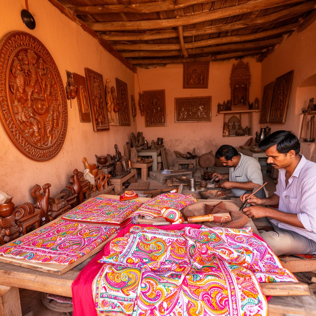 Shop for traditional handicrafts, block-printed fabrics, wooden art, souvenirs, and locally made products supporting village artisans and cultural heritage.